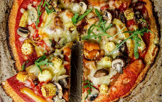 A much lighter and very tasty version of the conventional flour-based pizza.